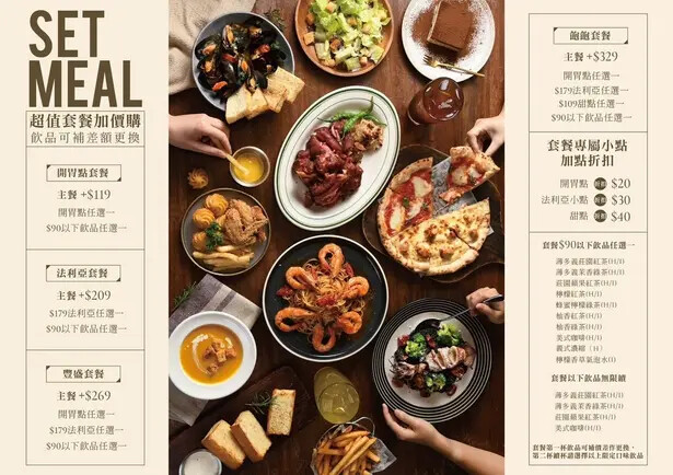 店內菜單涵蓋披薩、排餐、義大利麵、燉飯,以及各式小點、甜點與飲品,還可以彈性加價升級套餐,滿足不同用餐需求。