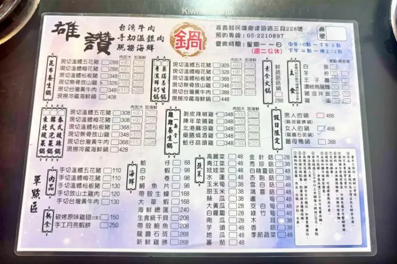 Kiwi從嘉義大林玩到這裡,特地來這家在地人狂推的「雄讚火鍋」吃午餐,真的超好吃。我們點了現切台灣黃牛肉、現切無骨放山雞,還有假日限定的龍膽石斑鍋。另外,餐點還可以加一份海鮮,只需要220元,真的超值划算!