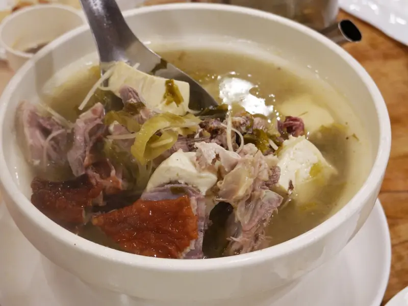而鴨骨酸菜湯則帶有酸菜的微酸滋味,恰好中和了鴨肉的油膩感,不過喝多了鹹度會稍高,建議分著喝更剛好。