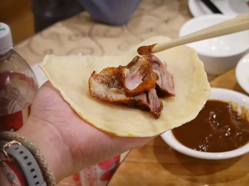 來到真福記當然要點烤鴨!這次我們預訂了一隻脆皮烤鴨,選了三吃組合。真福記選用的是肉質鮮美、脂肪較少的土番鴨,經特製調料慢烤,表皮呈現焦糖色澤,香氣四溢。師傅片鴨時刻意片得厚一些,肉嫩多汁,鴨油香氣濃郁,包進偏厚的荷葉餅皮,咬下去超滿足!