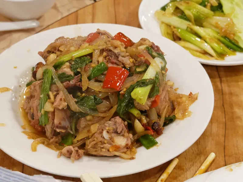 ▲北平烤鴨三吃 $1700(鴨肉絲高麗菜/鴨肉絲炒銀芽/醬爆骨架/鴨骨酸菜湯,任選二)