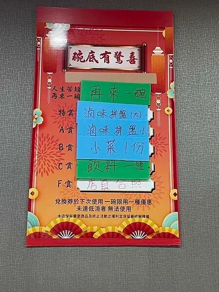 店內牆上有活動訊息, #碗底有驚喜,詢問店家驚喜的字樣會是什麼❓❓店家說:碗底會有#人生苦短,再來一碗、特賞、A賞~F賞,獎項就是 #再來一碗 ~ #與店員合照(老實說:店員大部分都是鮮肉級的)