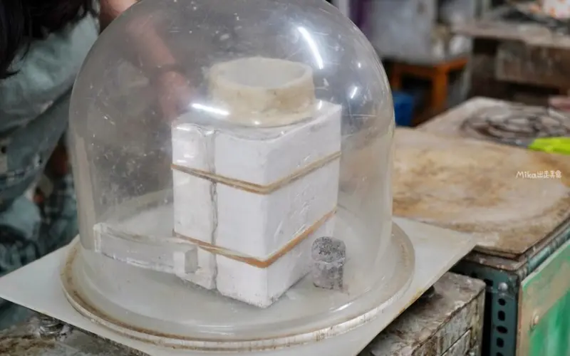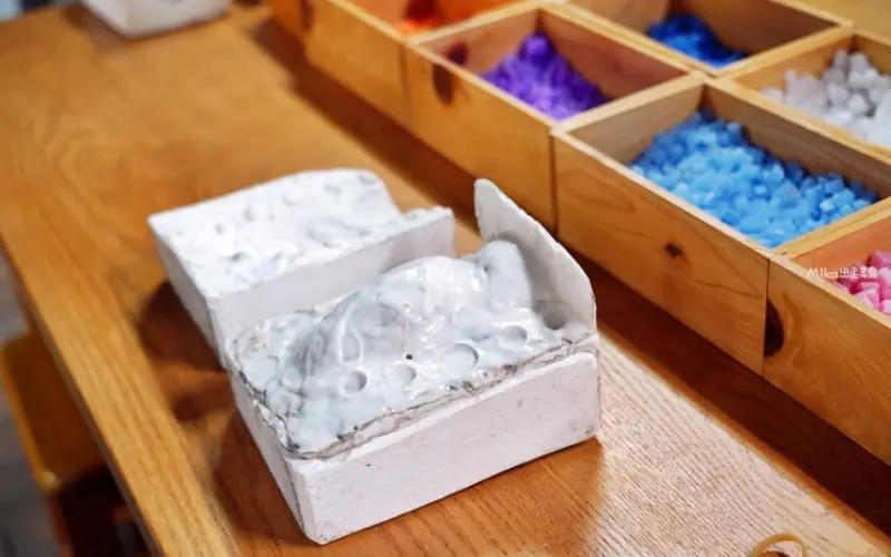 蠟燭DIY的過程有6個步驟,從放蠟塊→抽空氣→泡水→脫膜→蠟燭美容→完成。首先你會從各式造型中選擇自己喜歡的模具