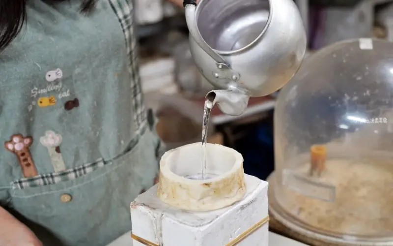 當蠟塊放好後,再倒入熱水抽出空氣,接著就可以等待蠟燭凝固,然後小心脫模!