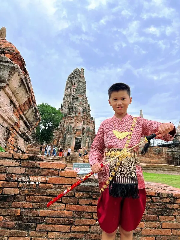 午餐後的行程開始,我們朝大城的「柴瓦塔那蘭寺」出發!這座被稱為「貴妃寺」的景點,是許多人來大城的必訪之地。司機剛停好車,我們還沒來得及買票入園,就看到對面一整排色彩繽紛的泰服出租店。雖然我和蘇菲早在曼谷訂好了泰服,原本打算在這裡略過,但翔哥突然說他想體驗看看!