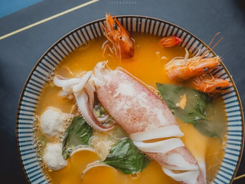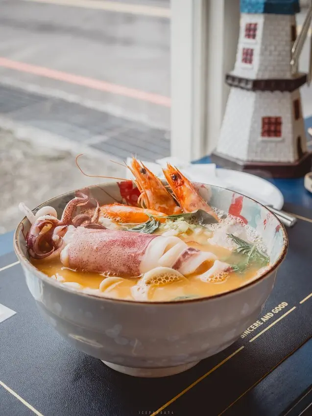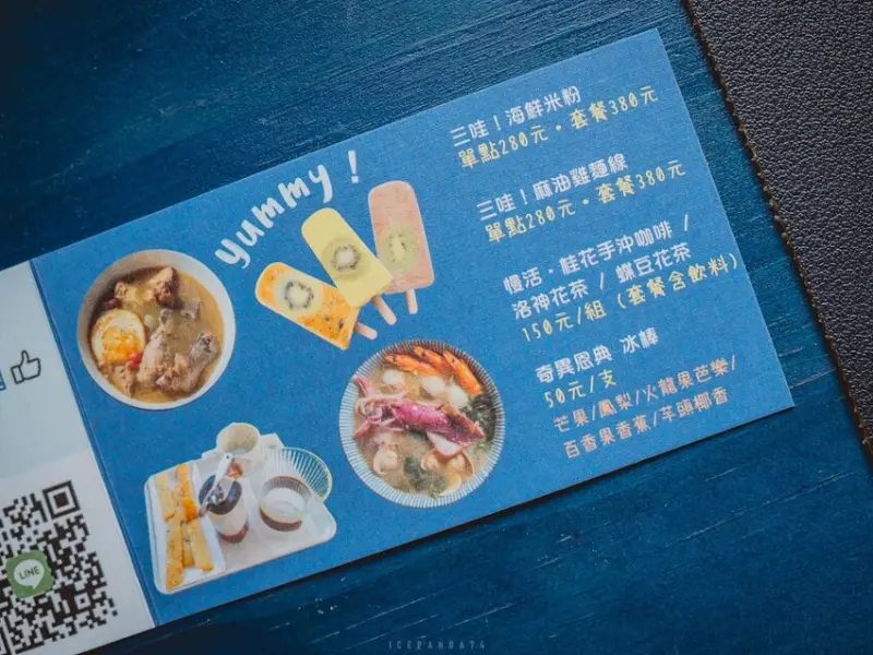 菜單雖簡單,但精緻。兩個主要品項——海鮮米粉和麻油麵線。除了單點,也可加價成套餐,包括一杯飲品或兩支冰棒。海鮮米粉湯頭鮮美,中卷(或魷魚)長度與碗直徑相同,口感Q彈,堪稱招牌之一。麻油雞麵線則是溫暖人心的必點佳餚。