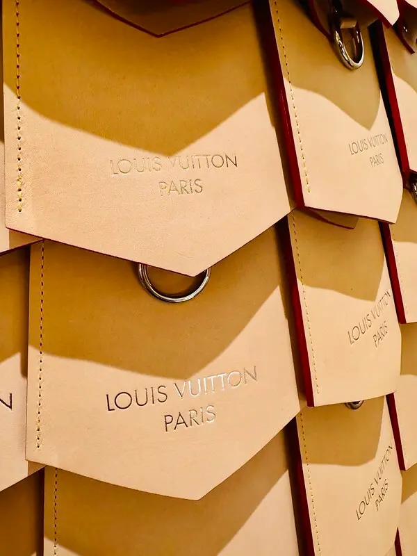 用一片片上頭有Louis Vuitton字樣的皮革,