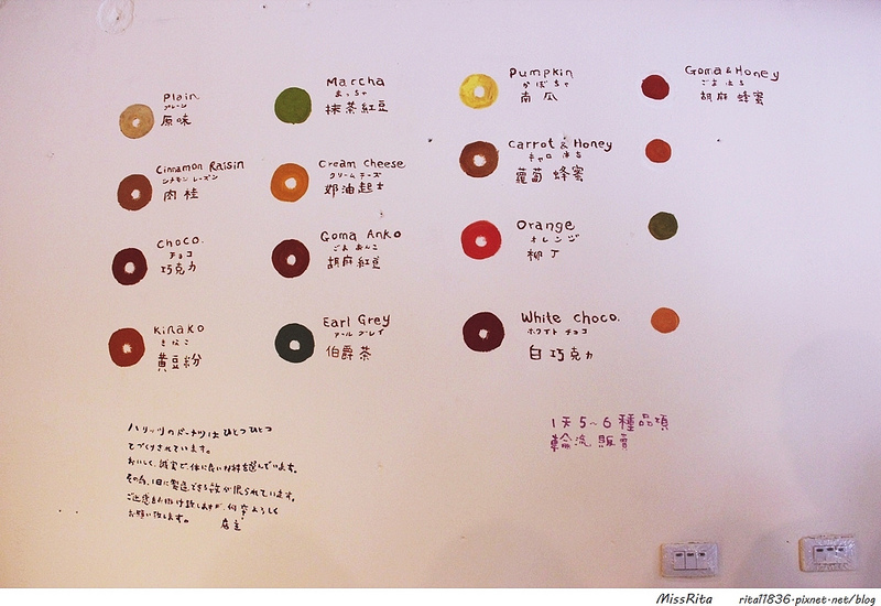走進店裡,看到旁邊的牆上畫著甜甜圈的口味和我看不懂日文