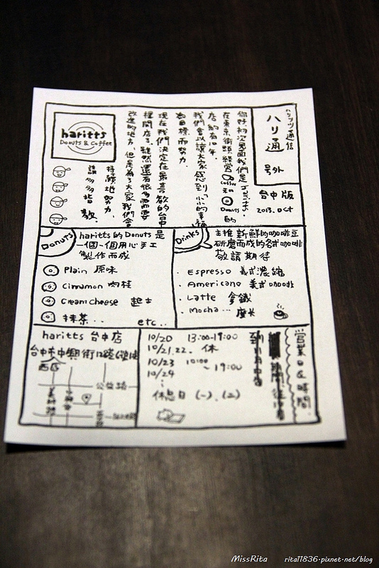 上頭寫著這間店的介紹和要對客人說的話,中間有手寫的甜甜圈口味和飲料名稱