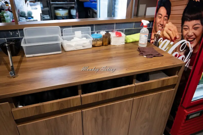 半自助模式有餐具碗筷可以自取,旁邊有味噌湯免費續,冰箱也有汽水、果汁、茶類等飲料,是要另外付費的唷。