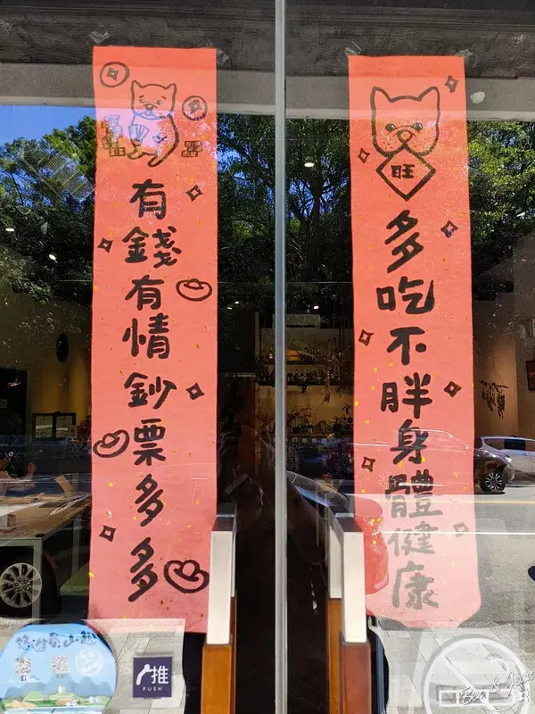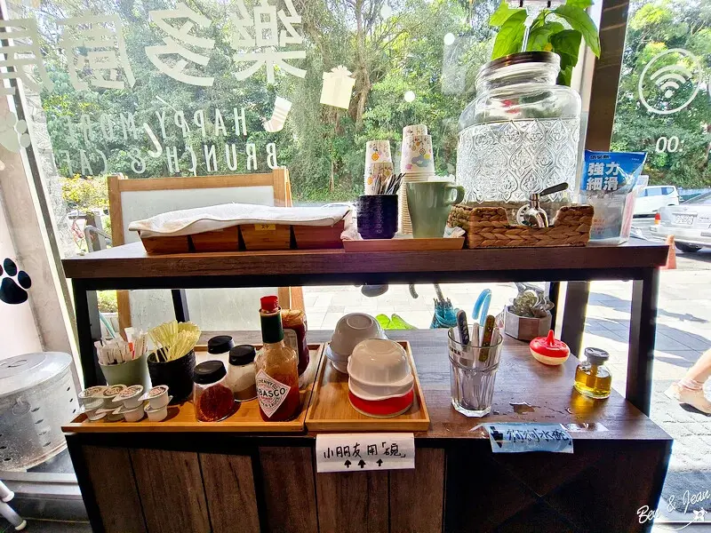 自助茶水區也非常方便,帶著毛小孩用餐的你可以輕鬆取用茶飲,店裡還設計了幽默的門聯,感覺整體氛圍既親切又輕鬆,超級加分!