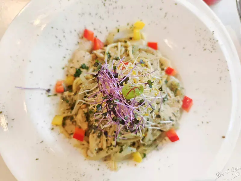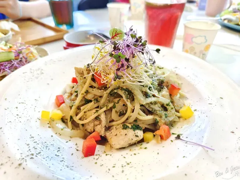 這道義大利麵選用羅勒青醬,濃郁的香氣讓人食慾大開,雞肉口感嫩滑,搭配Q彈麵條,每一口都充滿幸福感!