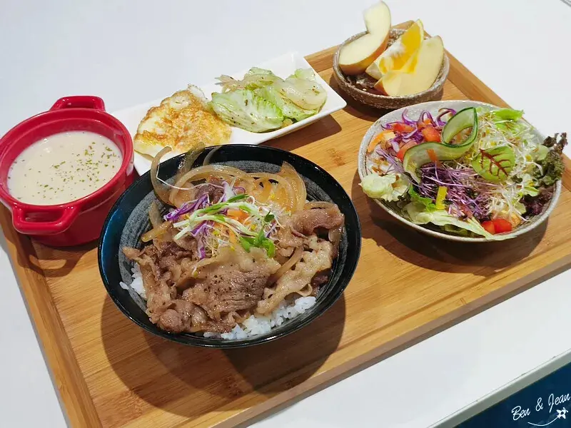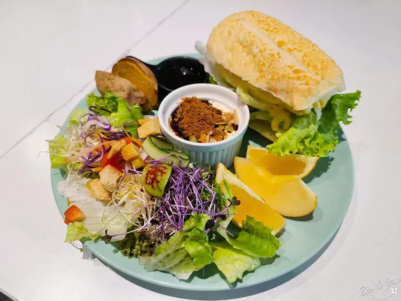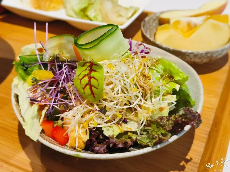 沙拉的生菜新鮮清脆,優格上還撒了堅果,吃起來健康又有層次感。