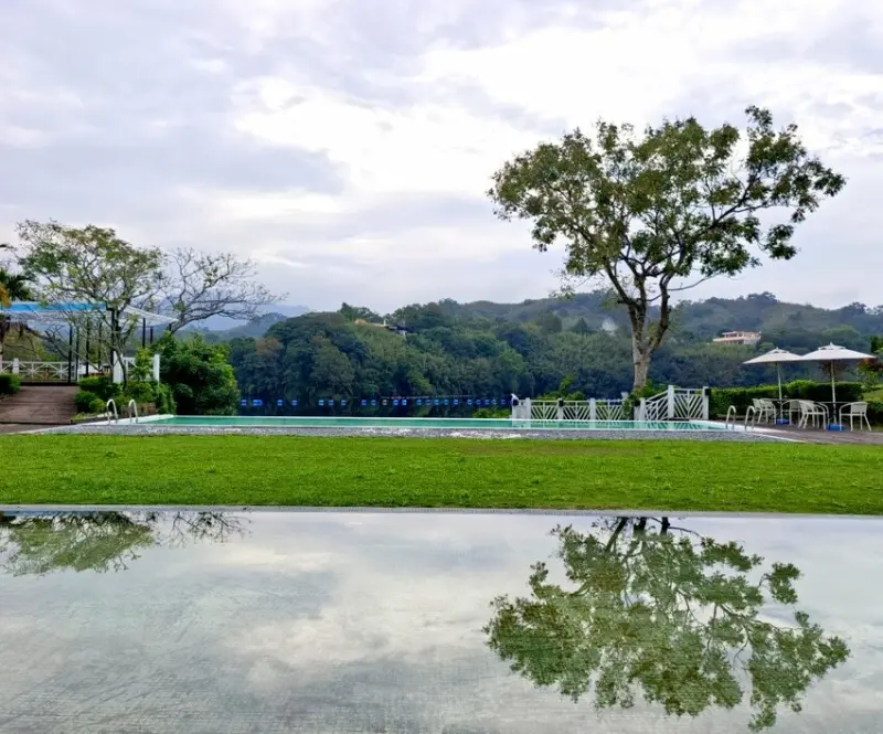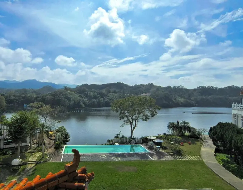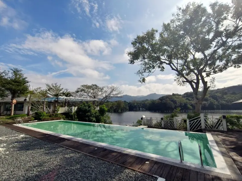 ▼旅店前方就是明德水庫湖景,天氣好的時候非常漂亮! 夏季來訪有提供戲水池可以使用,旅店還有腳踏車、KTV歡唱室、兒童電動賽車、麻將棋牌室等多種休閒設施,這是一個非常適合帶全家一起前來的飯店。