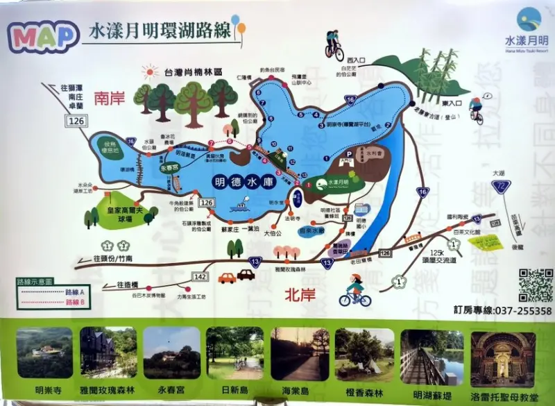 ▼環湖的路線有兩條,中間會經過日新島,套票內容也包含了日新島的入園門票,日新島是一座面積約3-4公頃的小島,島上風光秀麗,設有咖啡廳、觀景台等設施,並以兩座吊橋與外界連通,不騎腳踏車的話步行5分鐘也可以抵達。