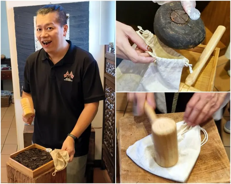 ▼老少咸宜的「客家撞茶」體驗,首先將已經歷「九蒸九曬」的酸柑茶讓入袋中,從側邊慢慢的敲碎,第二步驟還要再把較大片的外皮撿出來進行二撞,簡單的撞茶體驗就完成了!