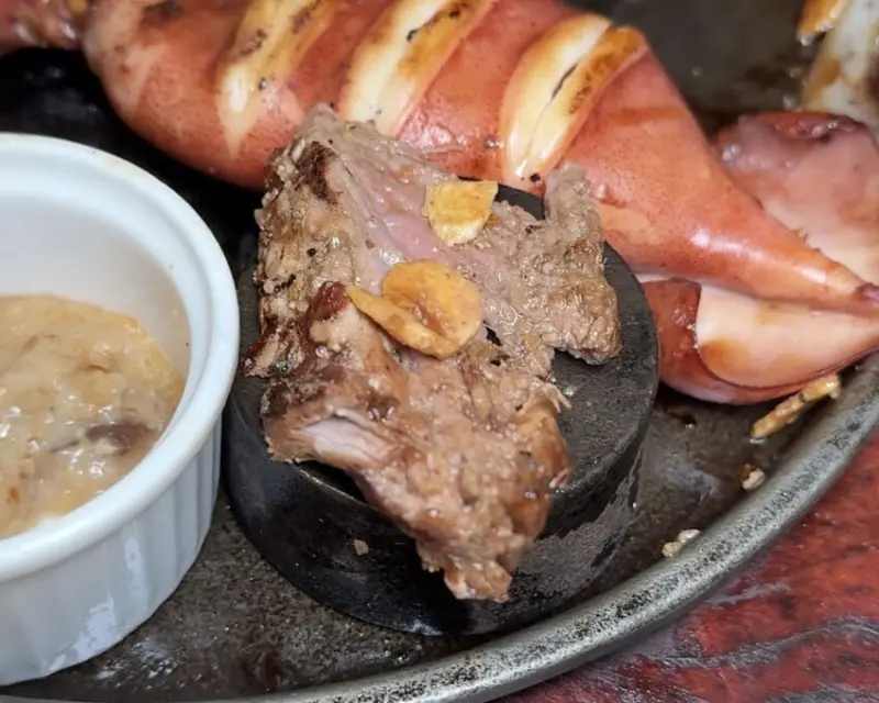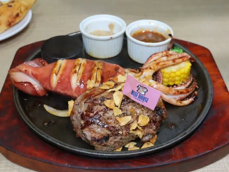 ▼推薦大家點雙人套餐最划算!除了可以吃到肉品、還有海鮮~直接來個海陸雙品大滿足!這一份是「頂級菲力牛排+炙燒魷魚」,份量都給的超有誠意耶