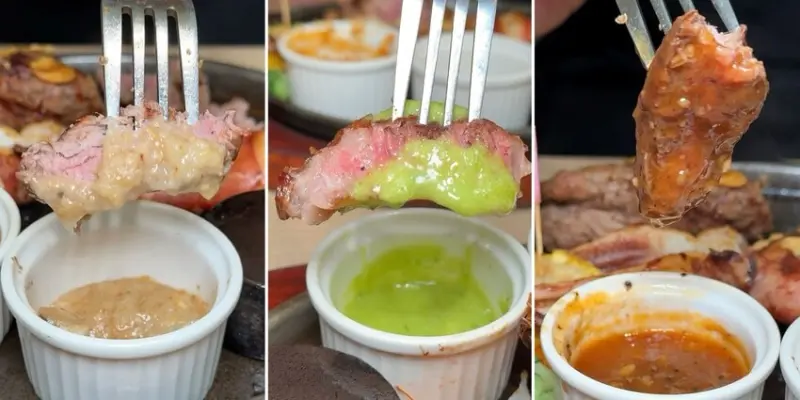 ▼有三種沾醬各有特色,最左邊是菲力牛排專用的牛肝菌奶油醬,帶點松茸蕈菇的味道,沾著肉品吃直接昇華成高級西餐廳XD。中間是我最愛的特製青蔥醬~在外面從沒吃過這麼特別的沾醬,沾著肉品吃超開胃又解膩!最右邊是牛排館常見的綜合醬,結合黑胡椒和蘑菇就是最經典不敗