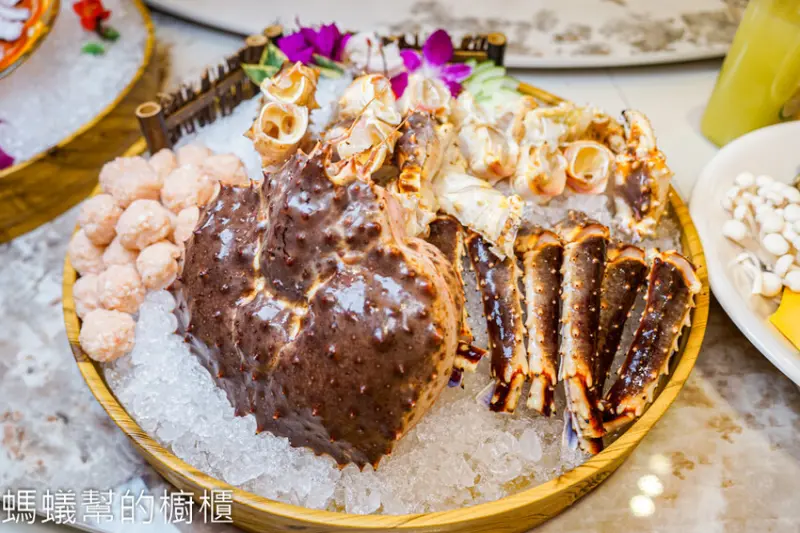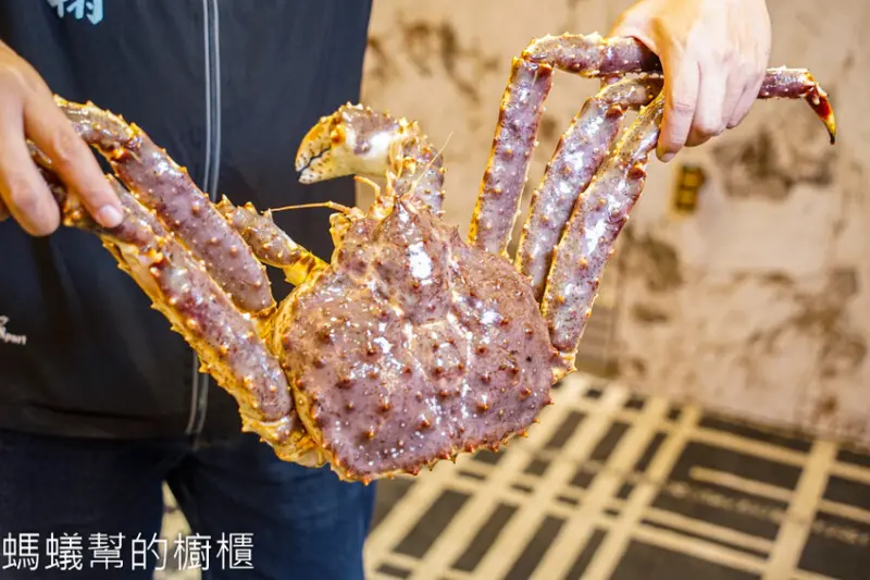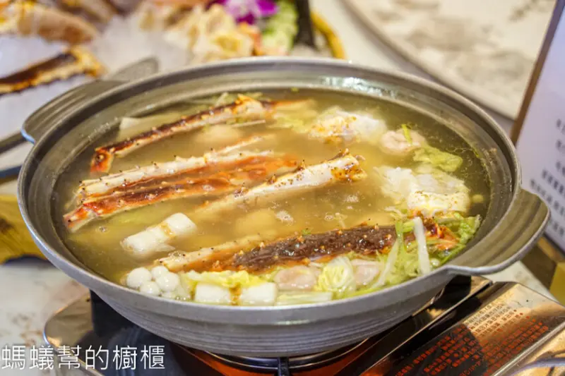 新鮮活體帝王蟹,蟹身跟蟹腳都已處理,搭上日式風味的海鮮鍋,菇類、食蔬、手工蝦丸,一同下鍋熬煮,整鍋滿滿鮮味,手工蝦丸彈牙,帝王蟹蟹肉扎實鮮美。