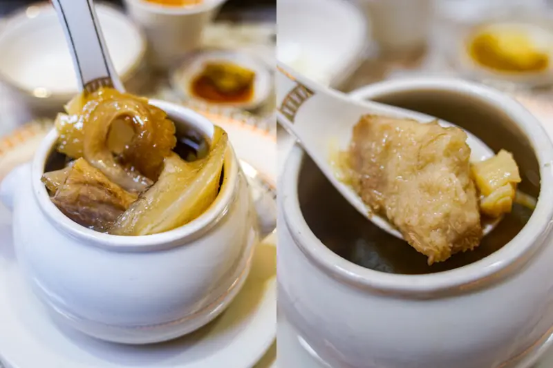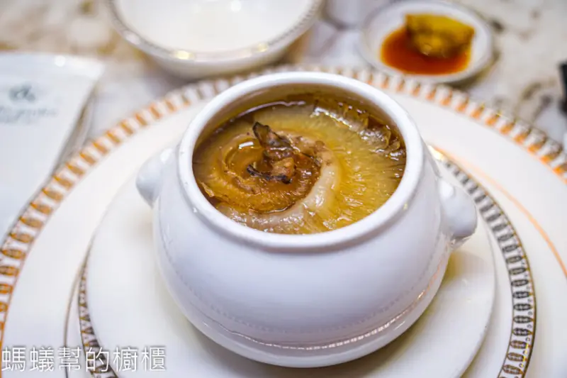 將經典的佛跳牆製作成個人盅呈現,加上整片魚翅更顯豪華感,由金華火腿、老母雞熬湯的鎮店之寶上湯打底,加入了厚度十足的珠貝、魷魚乾、芋頭、乾香菇、豬肚、大白菜等一起蒸製入味,各種好料組合,入口盡是讓人滿足的鮮美滋味。