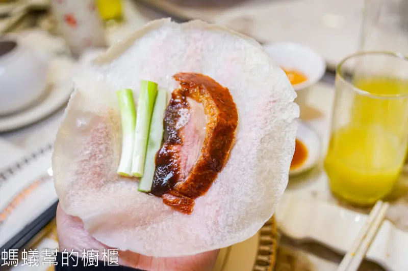 片皮鴨放在月光寶盒上,搭上甜麵醬、砂糖、小黃瓜、青蔥段使用蒸過的餅皮包裹起來,加上白砂糖多了一股香甜滋味,搭配白糖是經典吃法,醬汁鹹中帶甜增加風味,鴨皮酥脆、鴨肉肥嫩多汁,滿足口腹之慾。
