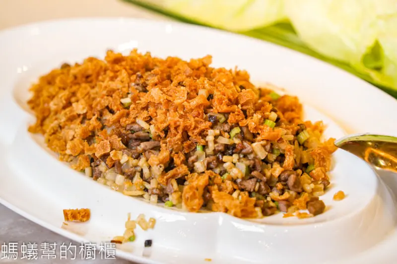 鴨肉切成碎狀加上炸的酥香的油條、脆筍、芹菜一起炒香,放在美生菜上,生菜鴨鬆真的是一絕,相當的清爽鬆脆,是我很愛的一道菜色。