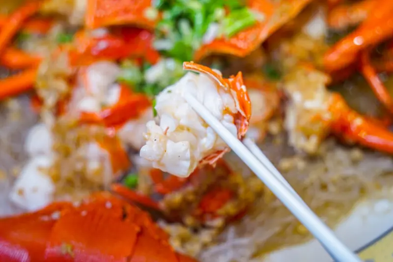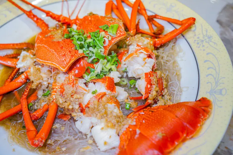 選用西澳及南澳空運來台的活體大龍蝦,每支足重1公斤以上,搭配特製的蓉醬汁,光是現撈現處理的野生龍蝦這肉質就相當飽滿鮮甜,蒜香香氣的醬汁一同融入最下方的粉絲,一起結合成鮮甜的粉絲煲口感,龍蝦彈牙,連粉絲都十足美味。