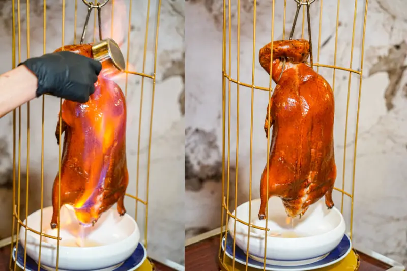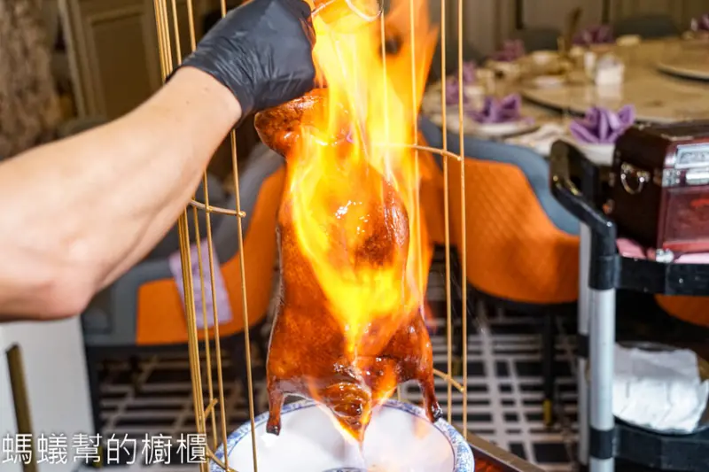 烤鴨一上桌就能看到火焰櫻桃鴨桌邊秀,使用君度橙酒並點火燃起,讓原本酥脆的鴨皮增添香氣,呈現焦糖色澤的晶亮烤鴨維持著一定的酥脆度,讓人目不轉睛!