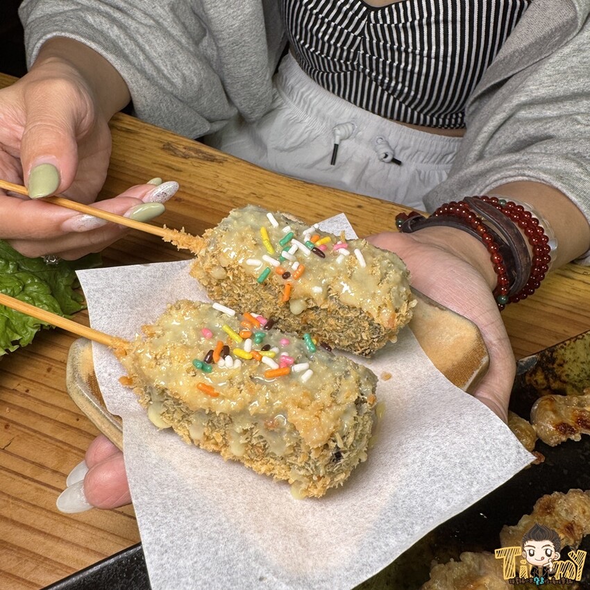 香酥七里香(120元/2串)一開始我們看不出這是雞屁股,後來發現原來是雞屁股對半切後,去除裡面的管子,所以吃起來沒有騷味,口感脆甜,不敢吃七里香的朋友可以嚐看看