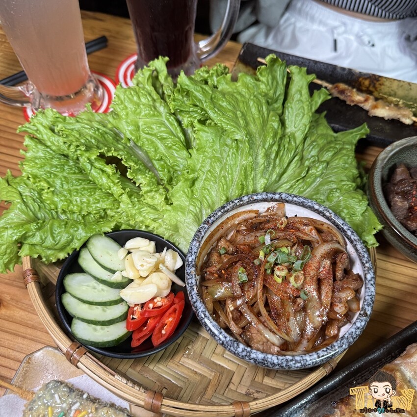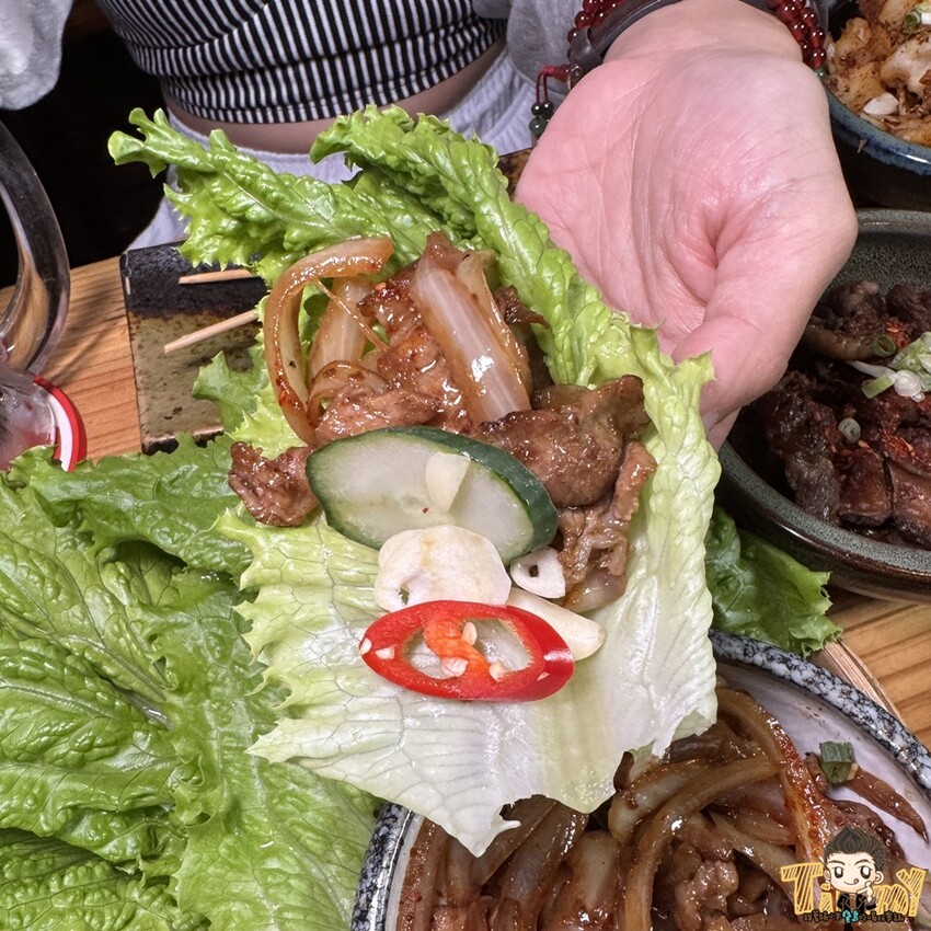 可以用生菜包裹小黃瓜、蒜片和辣椒一起吃,比較爽口且減低一些油膩感更棒喔!