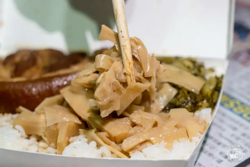 升級便當還會附上筍子、滷豆腐與鹹菜,筍子脆口鹹香,滷豆腐的鹹香風味更是絕配,鹹菜微酸爽口,搭配爌肉飯超開胃。