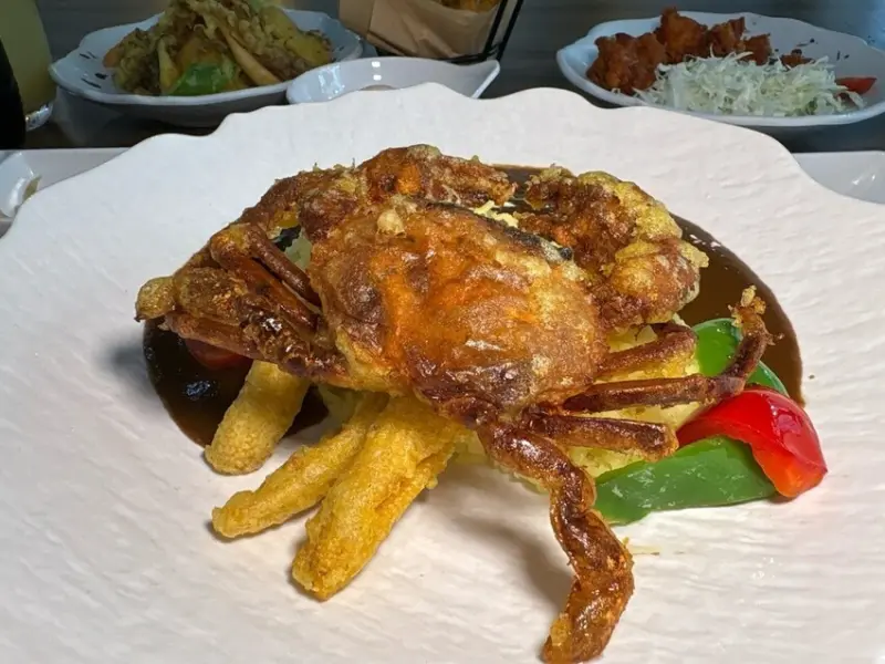 超大的軟殼蟹炸得金黃酥脆,再淋上濃濃的咖哩醬,香氣直接飄滿整個桌子!搭配升級套餐附的蔬菜天婦羅、溫泉蛋和特調氣泡茶,整個套餐既豐富又飽足,滿分推薦!