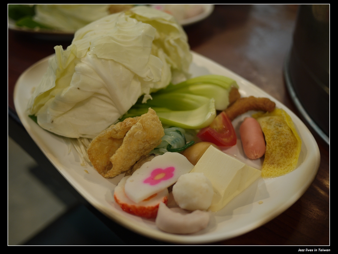 慢慢給掰的把菜盤的火鍋料與有的沒的依照個人的藝術能力而做擺放,