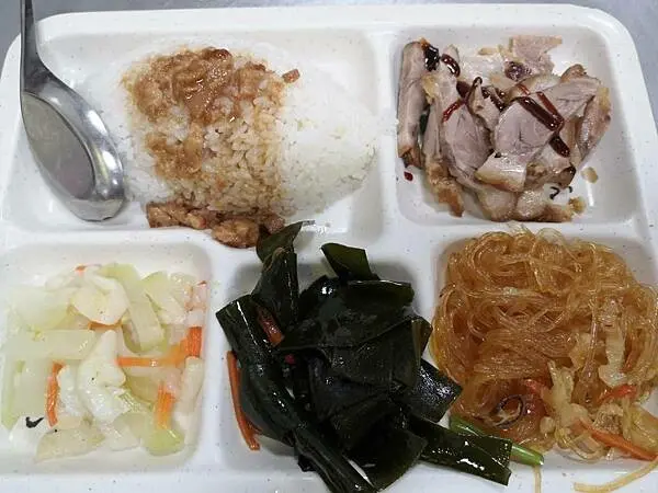 朋友點的豬腿肉便當,內含三種配菜,再加上一碗淋滿香濃魯肉汁的白飯,看起來十分豐盛。