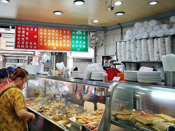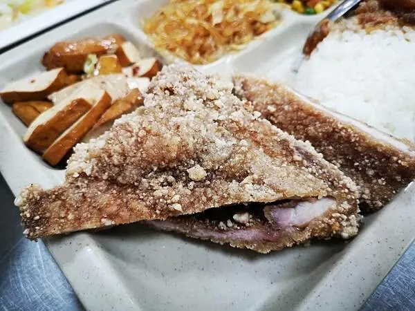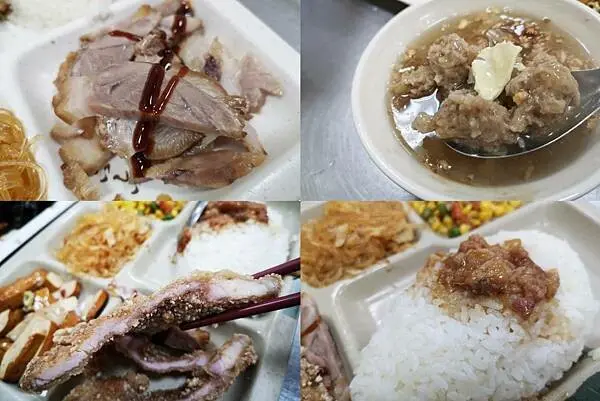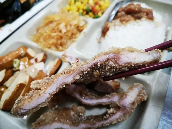 聽從朋友的建議,我點了炸豬排便當,還搭配三樣配菜。店裡的配菜種類相當多,正好有不少是我喜歡的。原本我想單點魯肉飯和肉羹湯的絕配組合,但朋友說便當更划算,因為白飯也會淋上魯肉汁。於是,我改點了便當,再額外加點一碗肉羹湯來搭配。