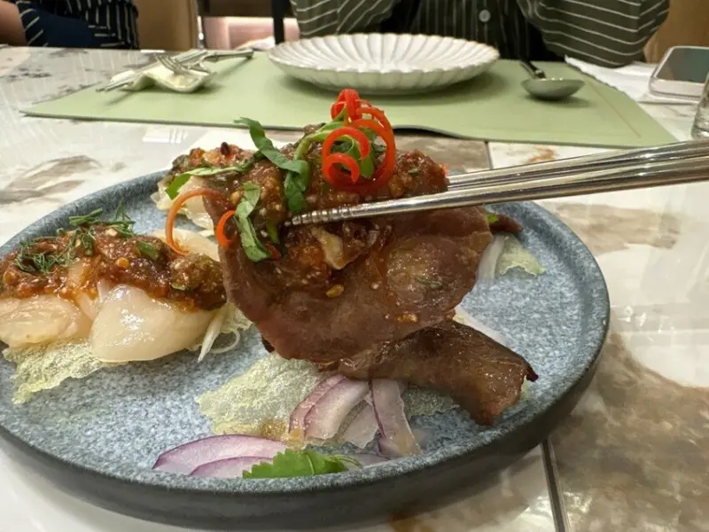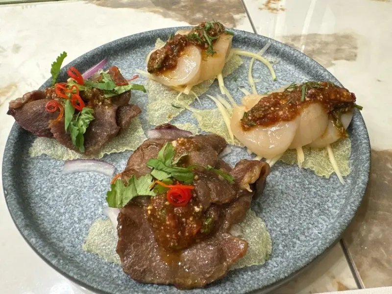 干貝新鮮又軟嫩,入口即化的口感令人驚豔,完全沒有腥味;牛舌的外皮煎得微微焦脆,內部口感豐富且肉質滑順,搭配主廚特製的佐料,層次感十足,真的很好吃!
