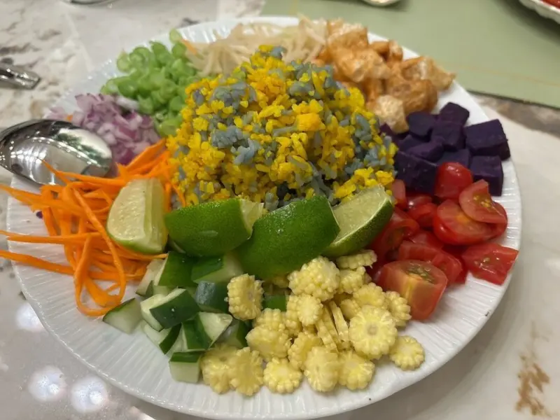 Lavish 132的主食色彩繽紛,讓人食慾大開。主廚選用薑黃米搭配多種健康新鮮的食材,如番茄、玉米、胡蘿蔔、地瓜、洋蔥等,再搭配泰國進口的炸豬皮,呈現豐富的視覺效果。