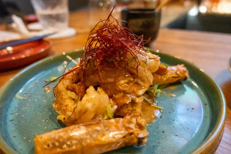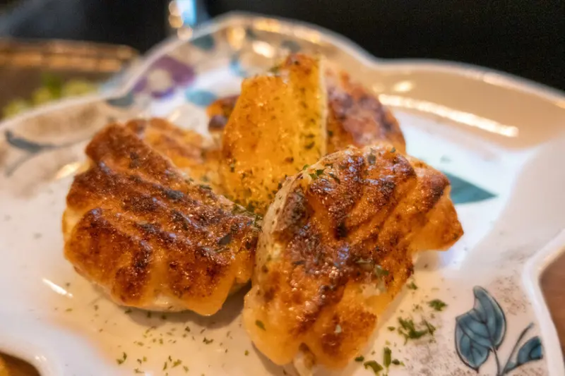 去殼的蝦肉讓品嚐更加方便,鮮甜彈嫩的蝦肉配上濃郁的蒜味奶油醬,再點綴一點辣椒絲,提升整體的風味層次。這道濃香不膩,搭配清酒更是完美無敵!