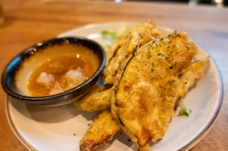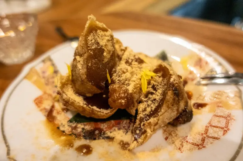 金黃酥脆的天婦羅外皮包裹著甜而不膩的南瓜與栗子餡,外酥內甜的口感層次令人驚喜。這道在餐酒館中並不常見的天婦羅,是創意與傳統的完美結合。