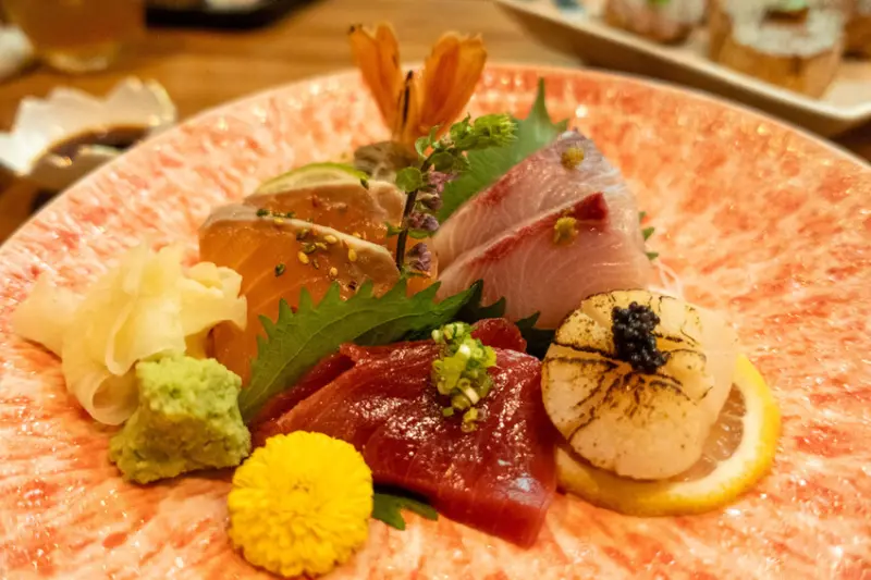 刺身拼盤由鮭魚、鮪魚、青甘、干貝和甜蝦組成,色彩繽紛,鮮度爆棚!特別是青甘搭配柚子胡椒醬,清新不膩,視覺與味覺雙重享受。