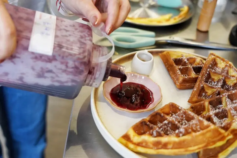 格子鬆餅搭配藍莓果醬、新鮮藍莓點綴!鬆餅除了可搭配果醬、蜂蜜,也能沾點鮮奶油一起吃~