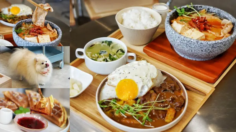 *三十好食距離大湳森林公園步行3分鐘!低消一人只要90元、不收服務費,主食300多元附一杯飲料,升級拿鐵只要加30元,老闆自己煮的牛肉咖喱好濃厚,想吃鍋也有韓式泡菜豬火鍋,格子鬆餅沾手工藍莓果醬也滿好吃,還有店狗毛小孩可以玩~