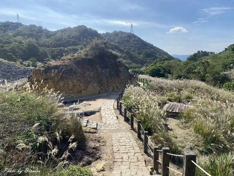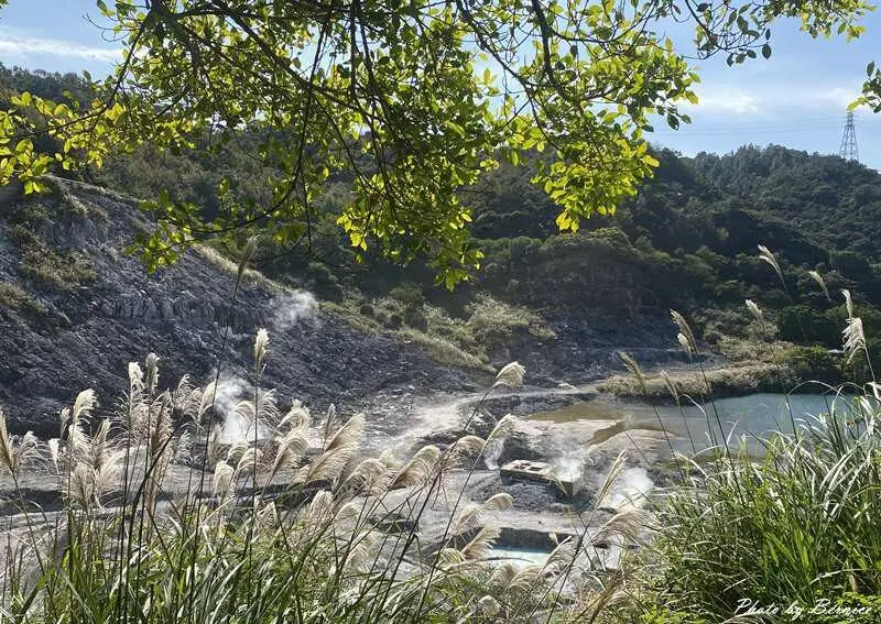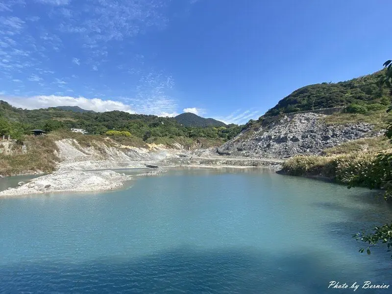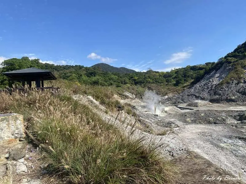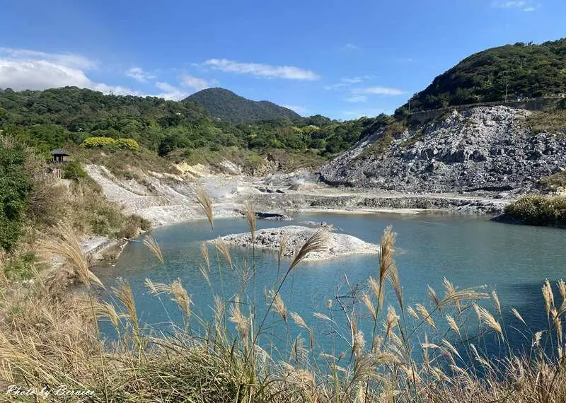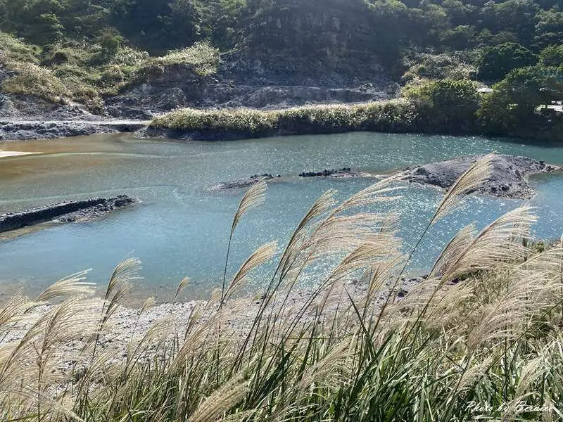 在涼亭旁就可以看到滿滿的芒草,不少人都在這拍照,因為此處可與芒花近距離接觸;今兒個天氣好,從觀景台看硫磺谷超美的,在藍天加持下,湖水呈現藍綠色拍照起來相當出片