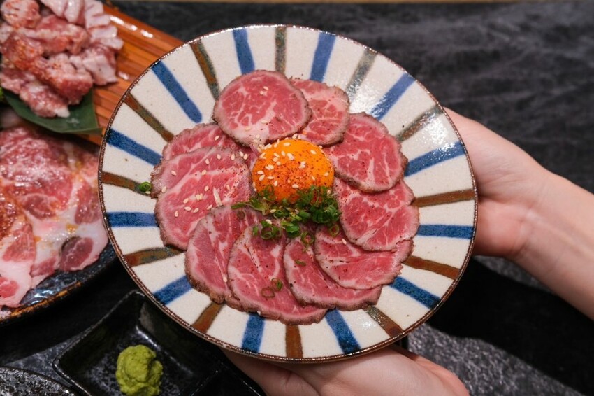 ▼有如生魚片的日式辣胡麻生牛肉,生牛肉外層有先炙燒約一分熟,劃破生蛋黃再淋上微辣胡麻醬,彷彿頂級生魚片般入口即化。
