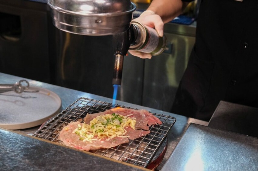 ▼長30公分的幻切牛舌,以純手工逆紋切製,從側面看起來厚度十足,烤後口感彈脆多汁,搭配昆布鹽和芥末一起享用,相當過癮。