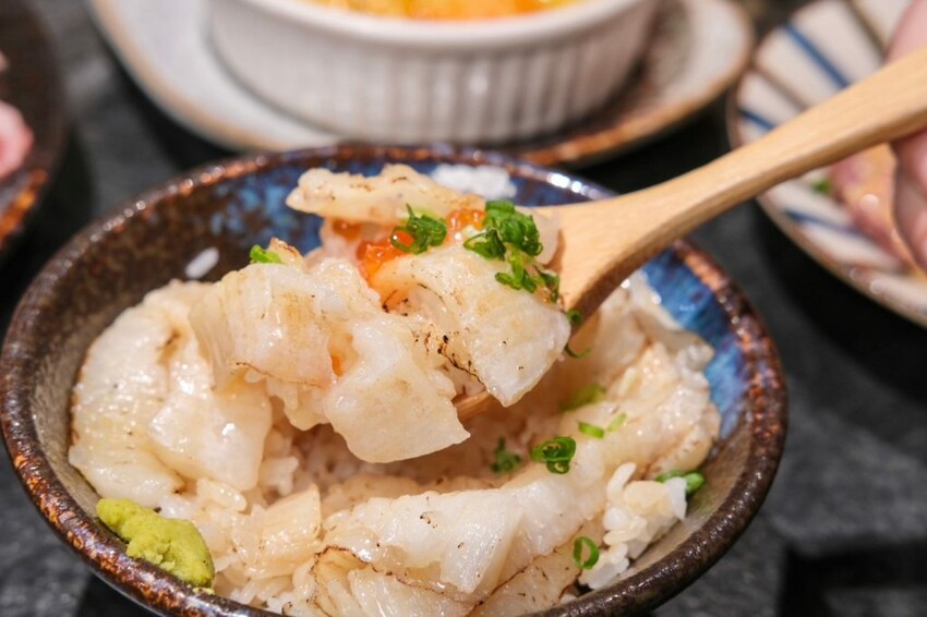 ▼大家一定要點的比目魚鰭邊肉蓋飯,將比目魚鰭邊肉炙燒後淋上秘制醬汁,底部搭配日本進口的越光米,豐富的油脂在嘴裡化開,讓人不知不覺就吃光光!