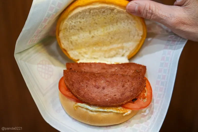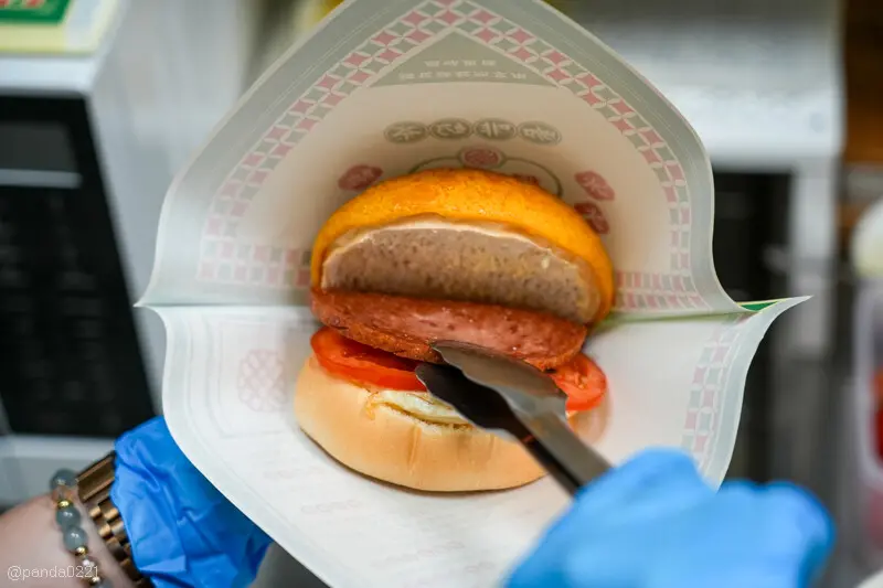 午餐肉蛋菠蘿包裡夾著午餐肉、番茄和蛋,午餐肉煎過後香氣逼人,吃起來也更香脆。