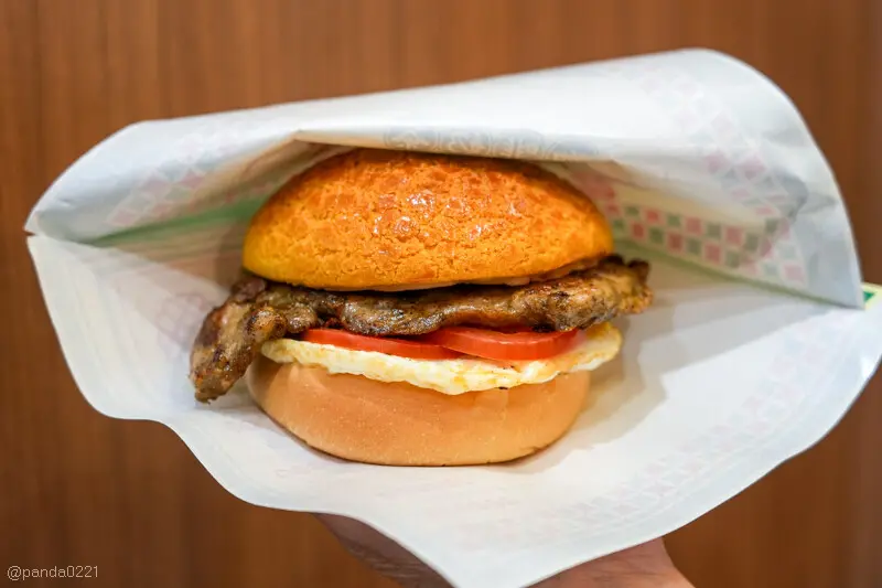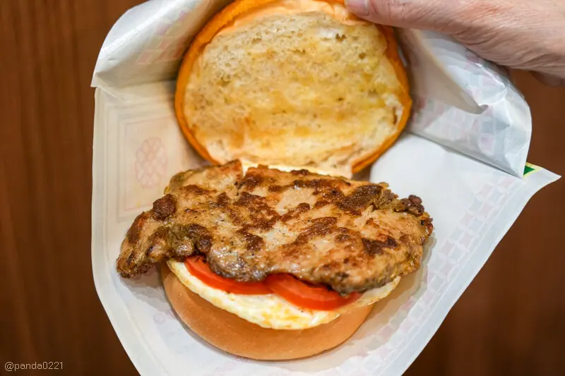 豬排煎蛋菠蘿包夾著豬排、番茄和蛋,豬排用獨家醃料醃製後煎得外酥內嫩,咬下去微甜酥脆,還帶有香鹹的味道,肉質柔嫩多汁,搭配半熟蛋的嫩蛋汁和清爽的番茄片,整體口感層次豐富!