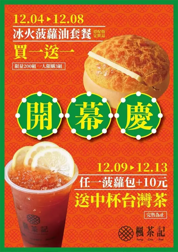 - 12/4-12/8 冰火菠蘿油套餐(含指定飲品)買一送一,限量200組,每人限購3組。