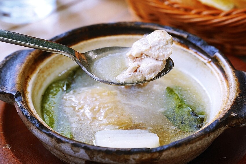 ▼來自花蓮半野放的方式飼養的土雞,經由熬煮後,膠質與脂肪受到乳化,雞湯呈現黃白色,當雞骨分解後,會釋出膠原蛋白。土雞汁多肉甜,湯品甘醇少油,用陶鍋可以使湯品持續保溫,更能拉長時間慢慢品嘗。
